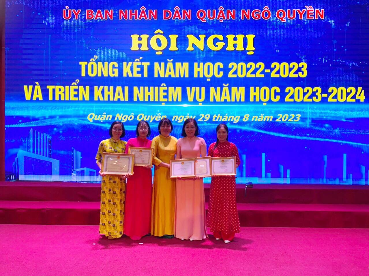 Sáng ngày 29/8/2023, UBND Quận Ngô Quyền đã long trọng tổ chức hội nghị Tổng kết năm học 2022 - 2023; Triển khai nhiệm vụ năm học 2023 - 2024 và Biểu dương Giáo viên Giỏi, học sinh Giỏi năm học 2022 - 2023. Thật vinh dự và tự hào khi các thầy cô giáo của nhà trường được vinh danh khen thưởng.