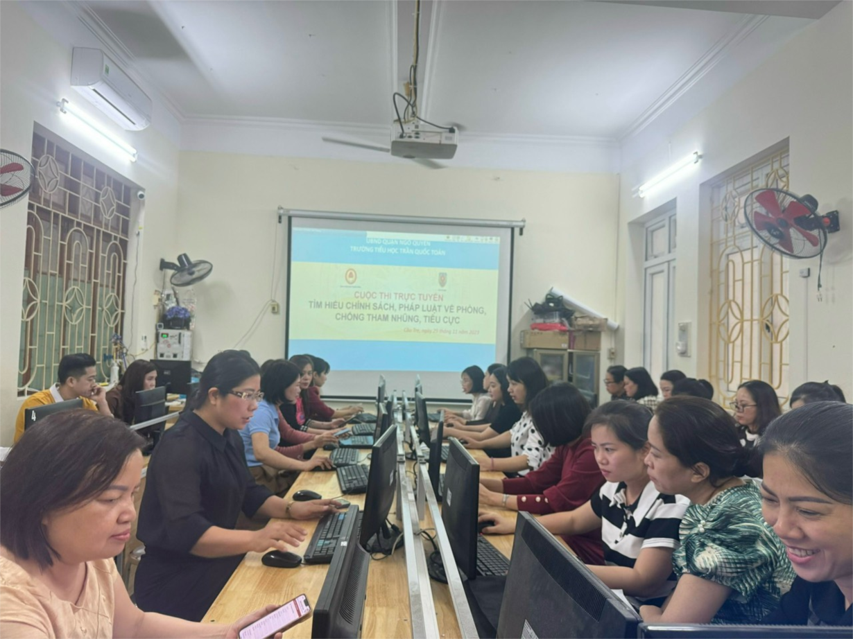 Thực hiện công văn số 3170/SGDĐT-TTr ngày 10/11/2023 của Sở Giáo dục và đào tạo về việc tuyên truyền, triển khai Cuộc thi trắc nghiệm trực tuyến “ Tìm hiểu chính sách, pháp luật về phòng, chống tham nhũng, tiêu cực”. Chiều ngày 29/11/2023, trường Tiểu học Trần Quốc Toản đã triển khai cuộc thi tới 100% CBGVNV nhà trường và được sự hưởng ứng tham gia tích cực của tất cả cán bộ, giáo viên, nhân viên nhà trường. Thông qua cuộc thi, cán bộ, giáo viên nhân viên nhà trường đã được nâng cao nhận thức, kiến thức về chính sách, pháp luật về phòng, chống tham nhũng, tiêu cực; qua đó tiếp tục đẩy mạnh công tác đấu tranh phản bác quan điểm sai trái , luận điệu xuyên tạc của các thế lực thù địch về công tác phòng, chống tham nhũng, tiêu cực.