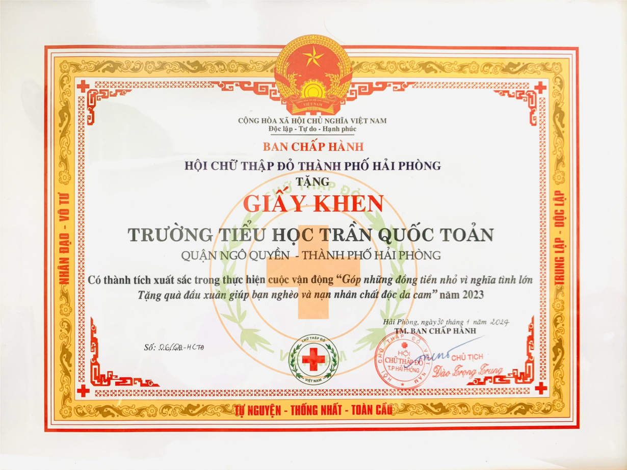 Tại Hội nghị, trường Tiểu học Trần Quốc Toản vinh dự được nhận Giấy khen của Hội Chữ thập đỏ thành phố vì đã có thành tích xuất sắc trong thực hiện cuộc vận động “ Góp những đồng tiền nhỏ vì nghĩa tình lớn, Tặng quà đầu xuân giúp bạn nghèo và nạn nhân chất độc da cam” năm 2023.