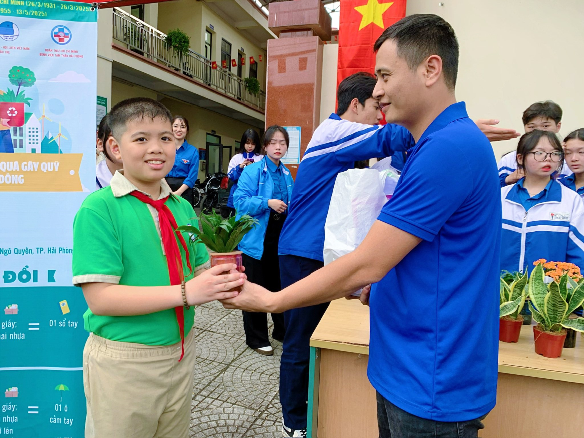 Chào mừng kỷ niệm 94 năm ngày thành lập Đoàn TNCS Hồ Chi Minh (26/3/1931-26/3/2025), 70 năm giải phóng Hải Phòng (13/5/1955-13/5-2025), thiếu nhi Liên đội trường Tiểu học Trần Quốc Toản tích cực tham gia chương trình đổi rác tái chế nhận cây, quà gây quỹ vì sức khoẻ cộng đồng do Đoàn thanh niên phường Cầu Tre phát động.