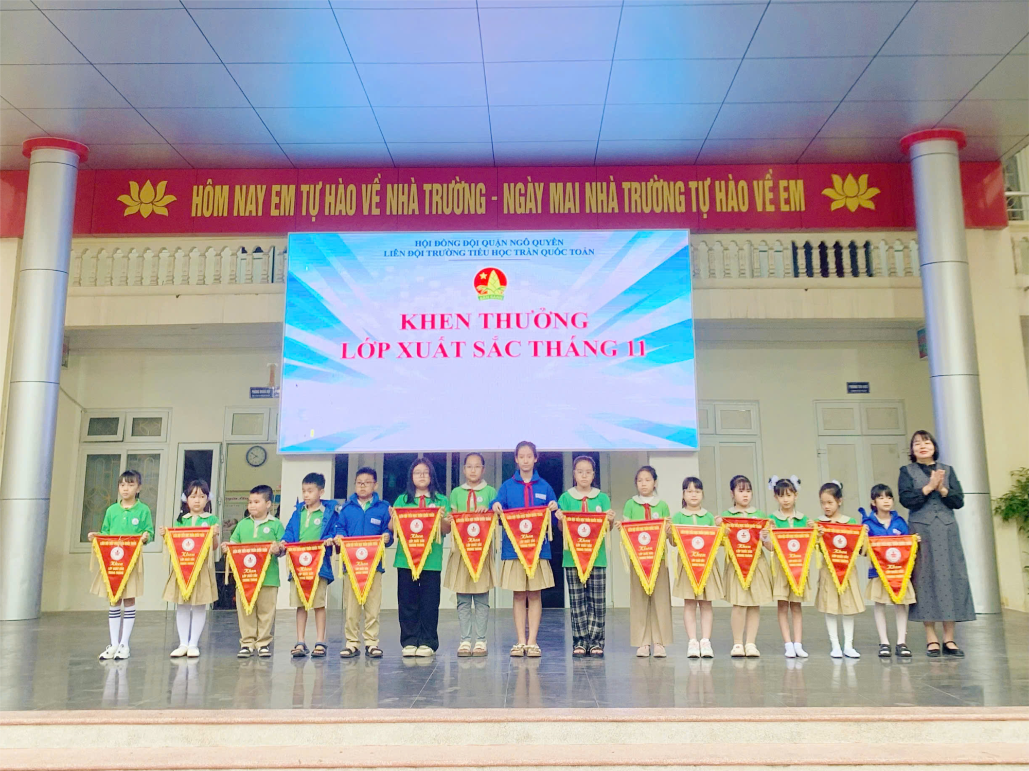 Phần nghi lễ chào cờ, hát Quốc ca, Đội ca diễn ra trong không khí trang trọng. Sau phần nghi lễ, cô giáo Đỗ Thị Phương Hảo – Giáo viên Tổng phụ trách đã đánh giá kết quả hoạt động tháng 11, chỉ ra những mặt được cũng như những tồn tại ở các lớp và triển khai kế hoạch hoạt động tháng 12 với chủ điểm “Uống nước nhớ nguồn”. Liên đội biểu dương, khen thưởng 15 tập thể xuất sắc và 28 gương thiếu nhi tiêu biểu làm theo 5 điều Bác Hồ dạy đến từ các lớp/