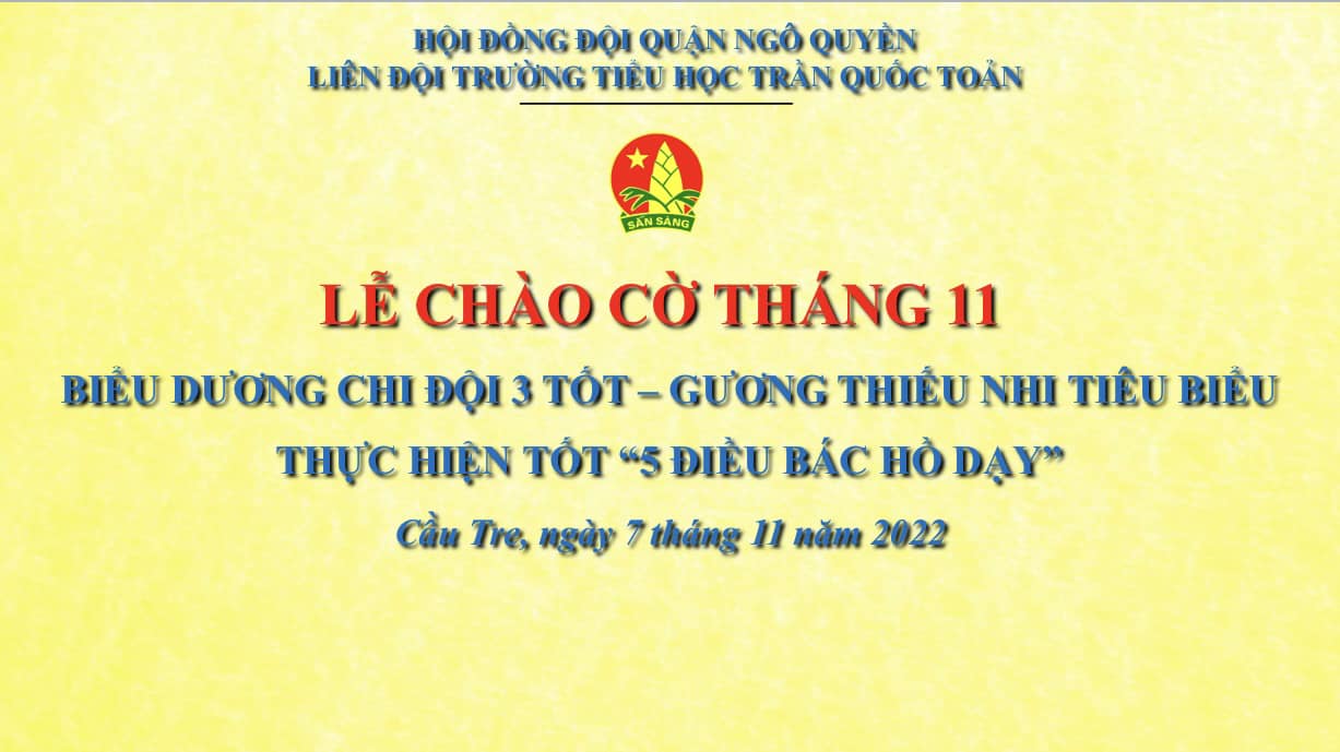 Ngày 7/11/2022 Liên đội trường TH Trần Quốc Toản long trọng tổ chức Lễ chào cờ tháng 11 thành công tốt đẹp.