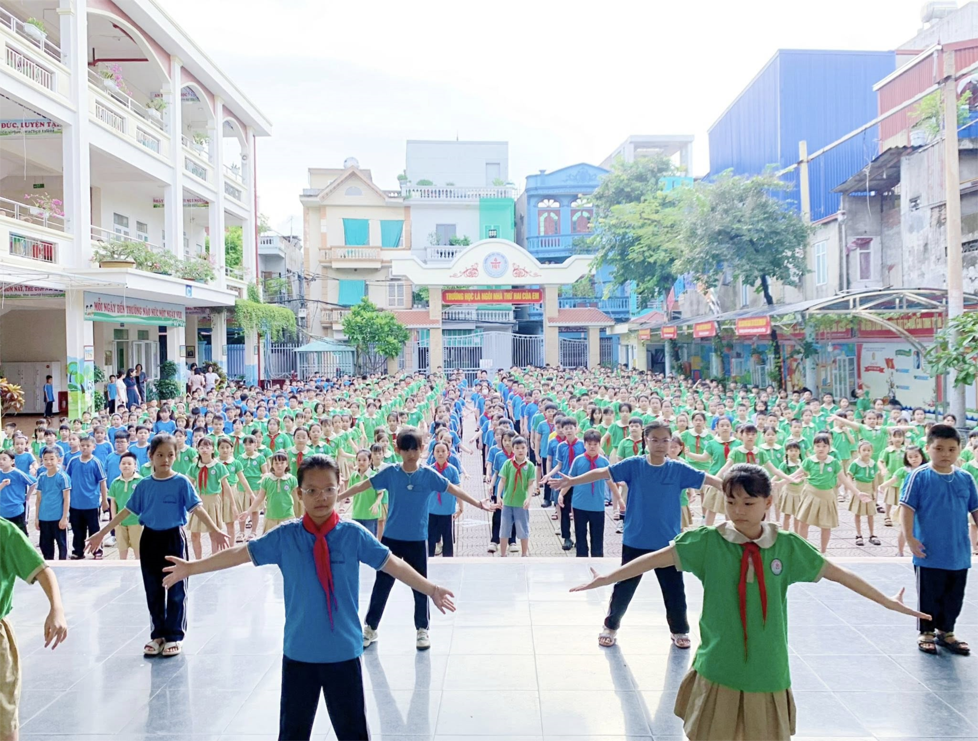 Mỗi buổi sáng, dưới sân trường rộn ràng tiếng nhạc, các em học sinh hào hứng tham gia những động tác thể dục đều đặn, khỏe khoắn. Hoạt động không chỉ giúp các em tăng cường sức khỏe, phát triển thể chất, mà còn tạo tinh thần vui tươi, phấn khởi để bắt đầu một ngày học tập hiệu quả.