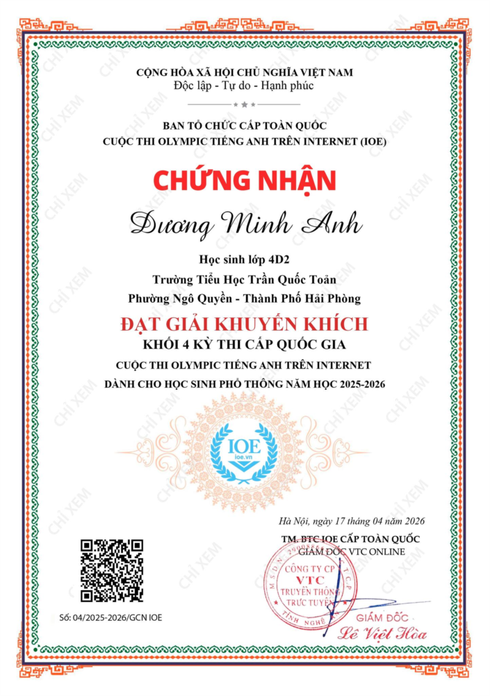 Chúc mừng em Dương Minh Anh đã xuất sắc ghi tên mình vào bảng vàng thành tích với Giải Khuyến khích cấp Quốc gia trong cuộc thi Olympic Tiếng Anh IOE cấp Quốc gia năm học 2025 - 2026. Đây không chỉ là niềm tự hào của cá nhân em, gia đình, nhà trường mà còn là nguồn cảm hứng lớn lao cho bạn bè và thầy cô. Thành công này là kết quả xứng đáng cho quá trình khổ luyện, sự kiên trì và niềm đam mê cháy bỏng với ngôn ngữ Tiếng Anh của Minh Anh. Vượt qua hàng ngàn thí sinh tài năng trên cả nước, em đã chứng minh được bản lĩnh, sự tự tin và tư duy sắc sảo của mình trên đấu trường tri thức lớn. Giải thưởng này chính là quả ngọt, khẳng định năng lực và mở ra những cánh cửa cơ hội rộng lớn hơn trong tương lai.
